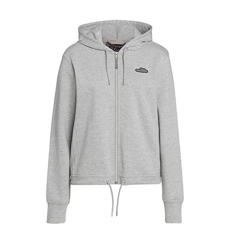 Cool vest voor dames in een trendy, iets kortere bijgesneden pasvorm met een ritssluiting over de hele lengte, kurken badge op de rug, een kap en trekkoorden aan de hals en in de taille. De grijze badge met kettingzaagmotief op borsthoogte is een echte blikvanger.